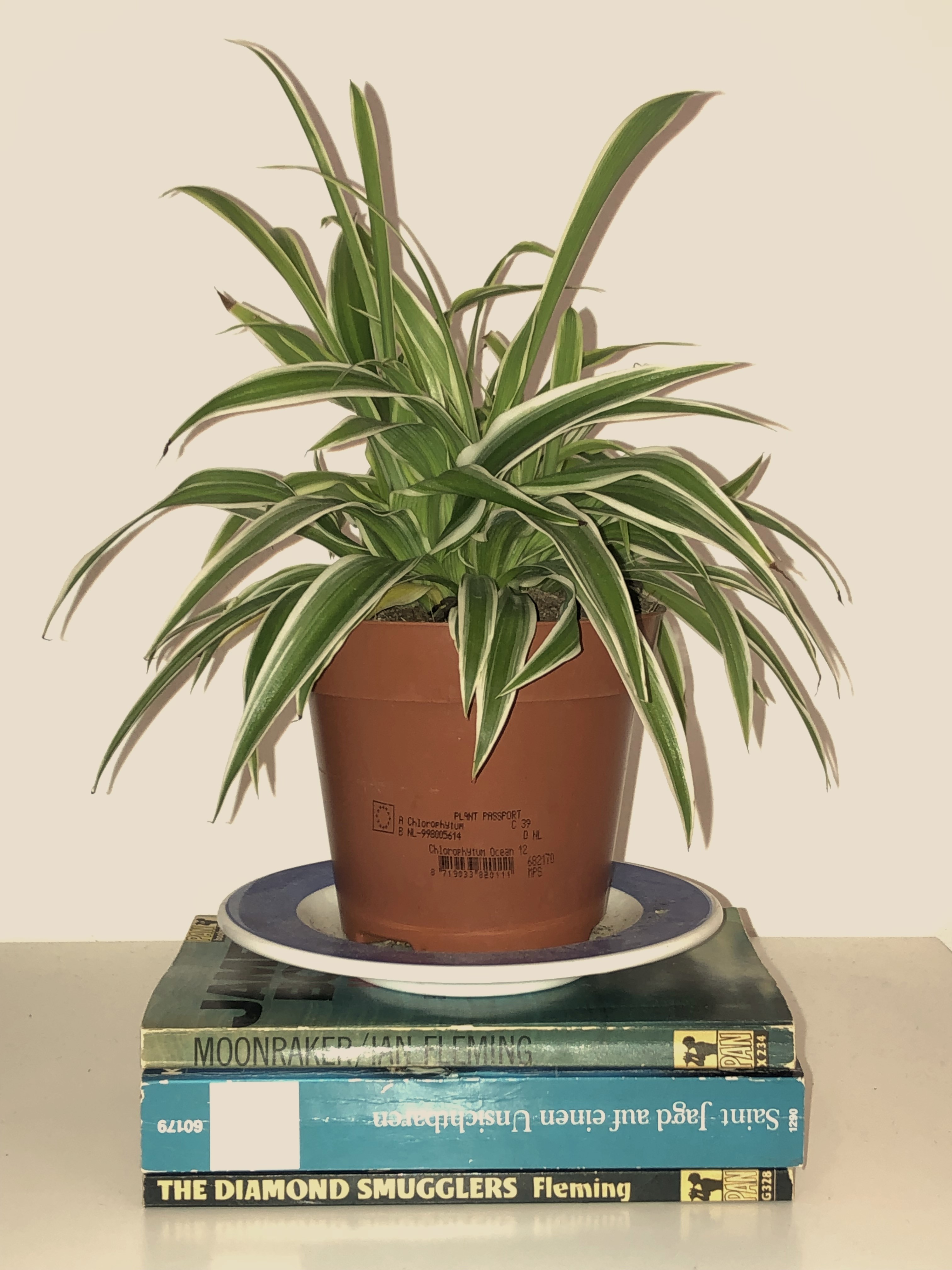 [2] Die in Rosetten stehenden Laubblätter sind 20 bis 45 cm lang und 6 bis 25 mm breit.[3] Die Laubblätter sind bei der Wildform grün und können, je nach Kultursorte, vollständig grün sein oder grün-weiße bis grün-gelbe Streifen aufweisen. Mein Exemplar ist von Ikea und gedeiht prächtig.
